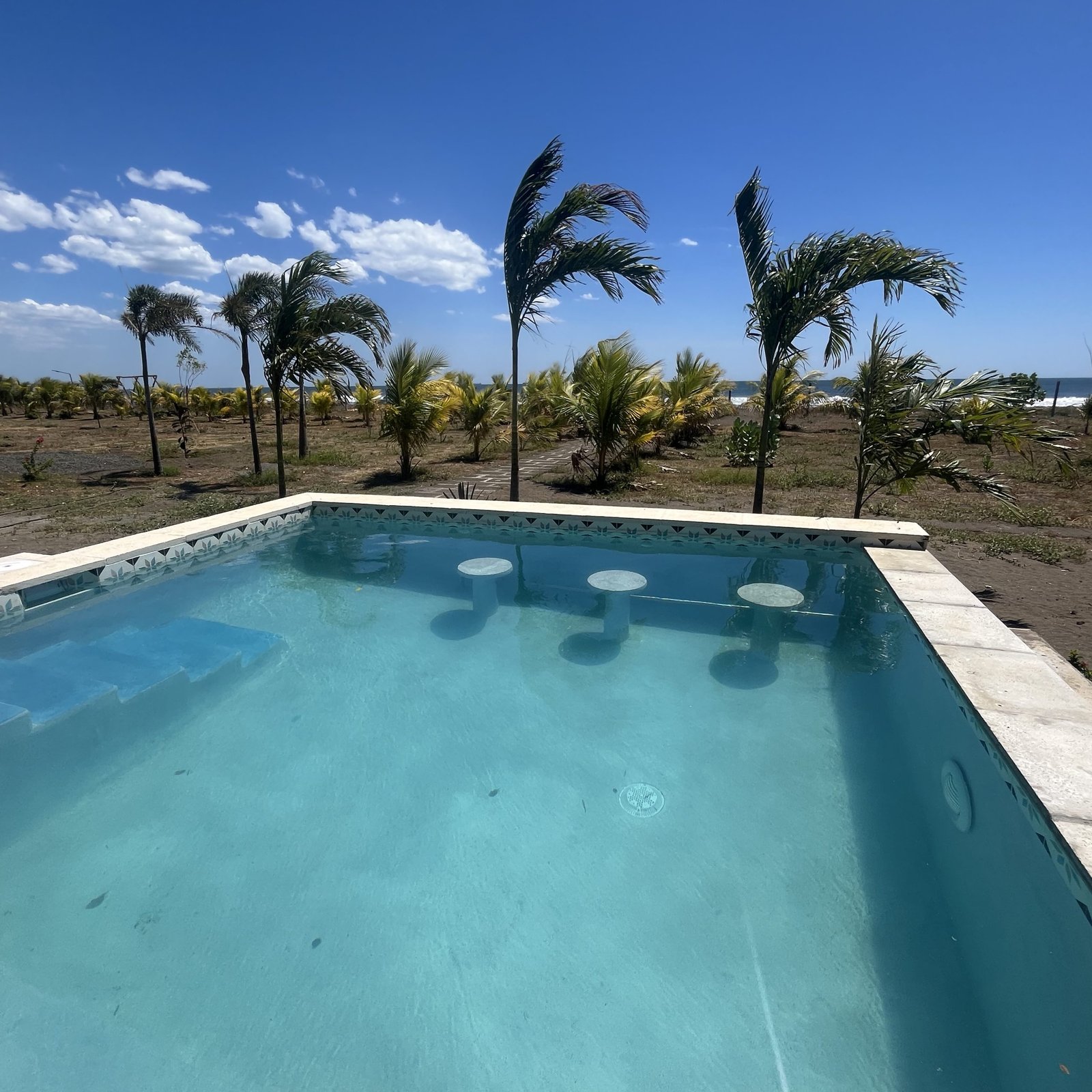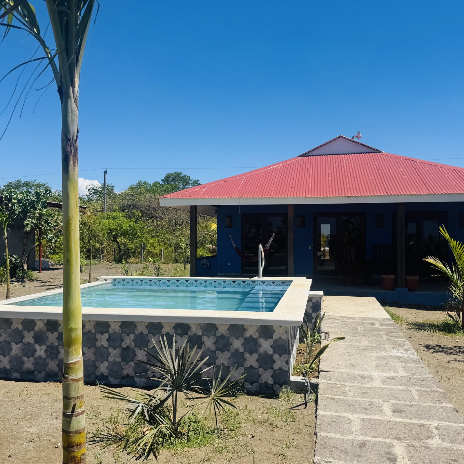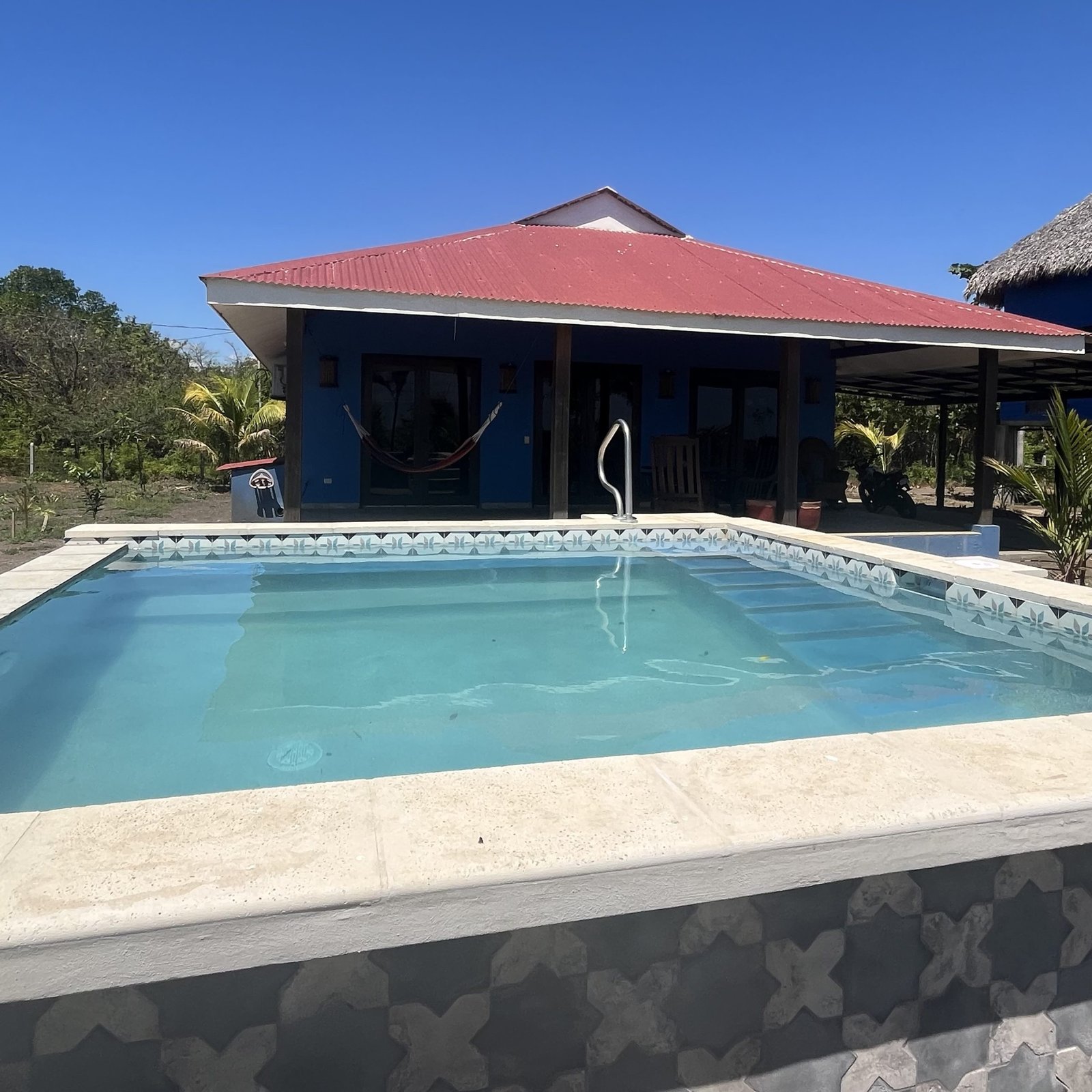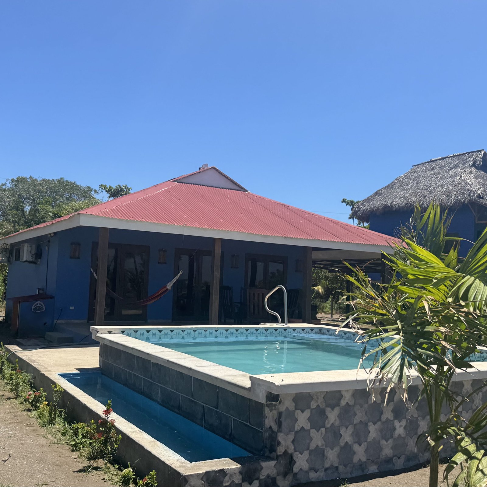 Welcome to Casa Azul — a charming western-style bungalow in Salinas Grandes, Nicaragua. This bright, open-plan retreat features a fully equipped kitchen, a comfortable living area, and two air-conditioned bedrooms. Step outside to a large shaded patio overlooking the beach and ocean, enjoy the privacy of your own newly installed pool, and relax beneath newly planted young trees that will grow to enhance shade and tropical ambiance. Ideal for 2–4 guests.